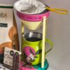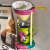 Una cafetera artesanal en aluminio y filtro de tela, de dos piezas que son un soporte de filtro y una olleta de 500ml con hermosas decoraciones de la artista MaClau.