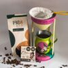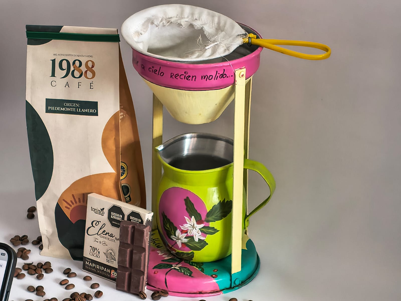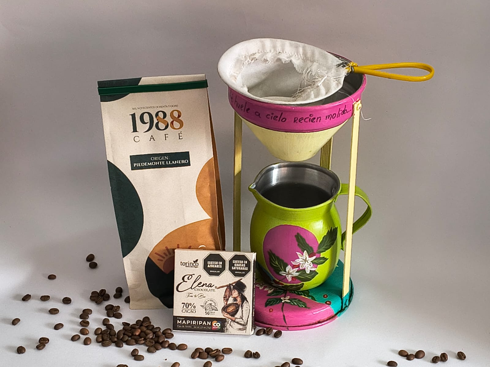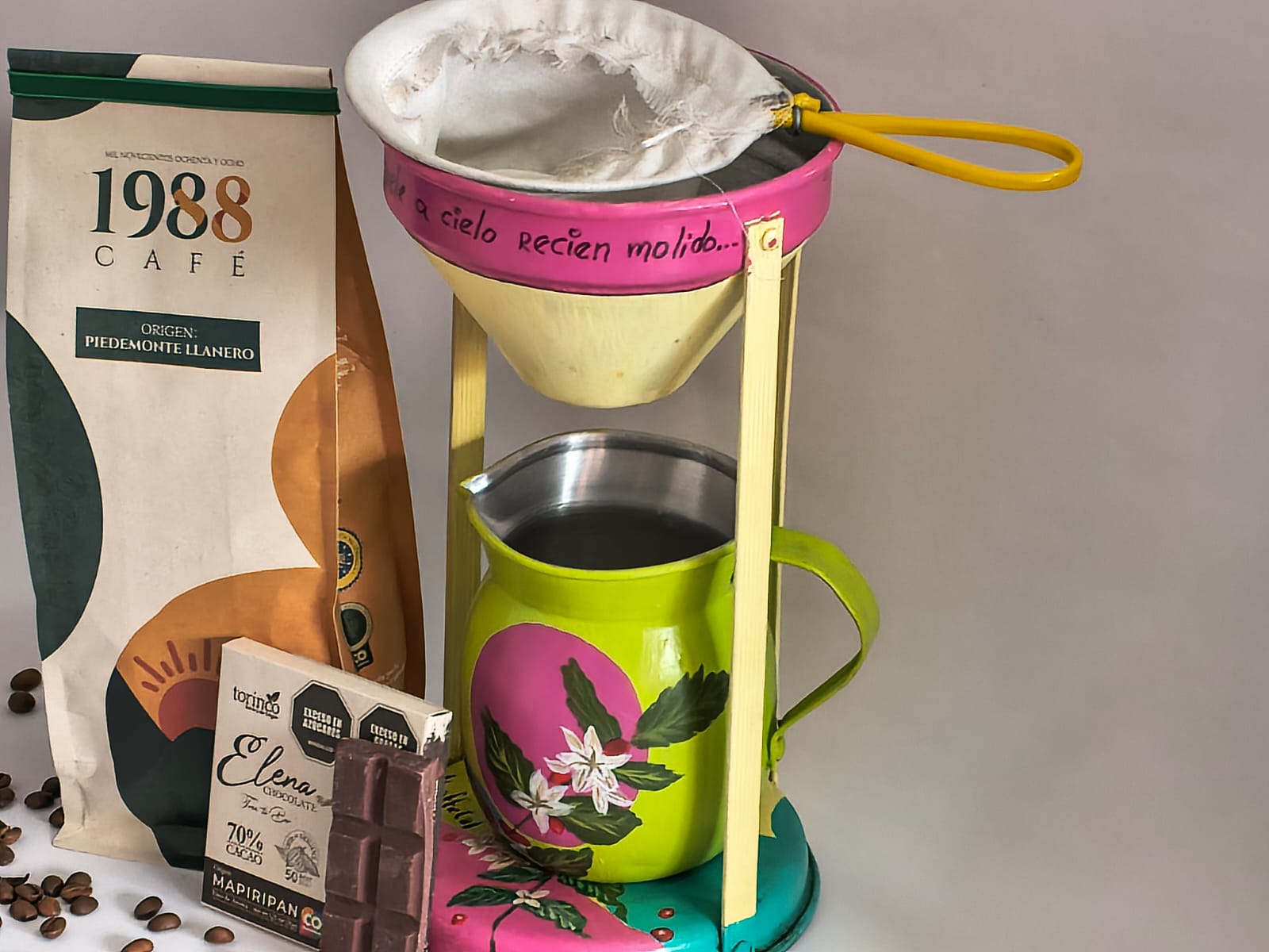 Este conjunto de piezas compuesto por una bella cafetera artesanal, decorada de manera artística con signos llaneros, una bolsa del insigne 1988 Café del piedemonte llanero y una barra de cacao de Elena Chocolate.
